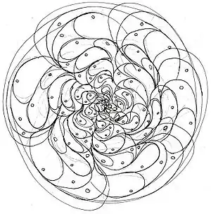 [Klüver’s] analysis of hallucinatory phenomena appearing chiefly during the first stages of mescaline intoxication yielded the following form constants: [emphasis original] (a) grating, lattice, fretwork, filigree, honeycomb, or chessboard; (b) cobweb; (c) tunnel, funnel, alley, cone or vessel; (d) spiral. Many phenomena are, on close examination, nothing but modifications and transformations of these basic forms. The tendency towards "geometrization," as expressed in these form constants, is also apparent in the following two ways: (a) the forms are frequently repeated, combined, or elaborated into ornamental designs and mosaics of various kinds; (b) the elements constituting these forms, such as squares in the chessboard design, often have boundaries consisting of geometric forms.[3]