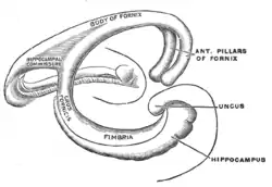 Here, it lies along the concavity of the hippocampus, on the surface of which some of its fibers are spread out to form the alveus, while the remainder is continued as a narrow white band, the fimbria of hippocampus, which is prolonged into the uncus of the parahippocampal gyrus.