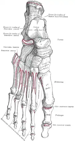 ![]() Bones of the right foot. Dorsal surface. Fourth metatarsal bone is the yellow bone second from the right | |