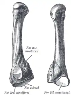 The base or posterior extremity is wedge-shaped.[1] The base presents an oblique quadrilateral surface for articulation with the cuboid; a smooth facet on the medial side, divided by a ridge into an anterior portion for articulation with the third metatarsal, and a posterior portion for articulation with the third cuneiform; on the lateral side a single facet, for articulation with the fifth metatarsal.