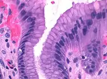 Foveolar cells or surface mucous[lower-alpha 1] cells are mucus-producing cells which cover the inside of the stomach, protecting it from the corrosive nature of gastric acid. These cells line the gastric mucosa (mucous neck cells are found in the necks of the gastric pits). The mucus-secreting cells of the stomach can be distinguished histologically from the intestinal goblet cells, another type of mucus-secreting cell.