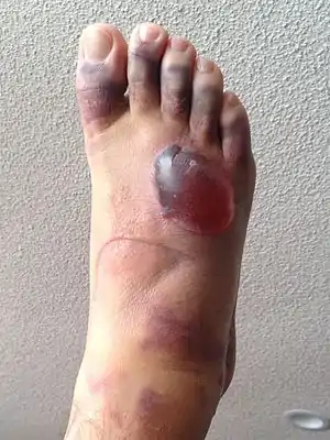 These blisters are thought to be caused by shearing forces applied at the time of injury.[3] There are two types described, based on their color: clear fluid and hemorrhagic. The difference lies in the level of the shear. Clear fluid blisters have separated within the epidermis, and hemorrhagic blisters separate at the dermal-epidermal junction. The clinical difference is healing time; clear blisters take about 12 days and hemorrhagic blisters heal in about 16 days. The decision to pop the blisters in order to treat the fracture, or wait for them to heal first usually hinges on the preferences of the orthopaedic surgeon as there is a lack of data on what treatment is ideal.[3] Waiting delays care an average of 7 days, and longer for tibial plateau and calcaneal fractures. Operating immediately anecdotally increases wound infection rates.