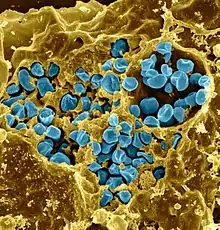 Francisella tularensis bacteria (blue) infecting a macrophage (yellow)