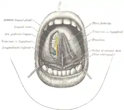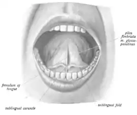The frenulum of tongue or tongue web (also lingual frenulum or frenulum linguæ; also fraenulum[1]) is a small fold of mucous membrane extending from the floor of the mouth to the midline of the underside of the tongue.