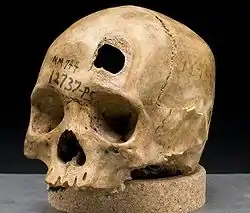 ![]() 19th Century skull showing sword-blade trauma on frontal bone. | |
