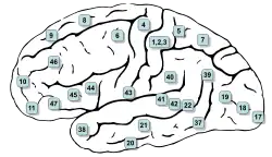 The frontal eye fields (FEF) are a region located in the frontal cortex, more specifically in Brodmann area 8 or BA8,[1] of the primate brain. In humans, it can be more accurately said to lie in a region around the intersection of the middle frontal gyrus with the precentral gyrus, consisting of a frontal and parietal portion.[2] The FEF is responsible for saccadic eye movements for the purpose of visual field perception and awareness, as well as for voluntary eye movement. The FEF communicates with extraocular muscles indirectly via the paramedian pontine reticular formation. Destruction of the FEF causes deviation of the eyes to the ipsilateral side.