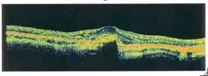 | An Optical coherence tomography (OCT) of the retina, showing a Fuchs spot | |