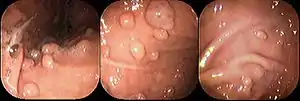 | Endoscopic image of fundic gland polyps taken on retroflexion of gastroscope. | |