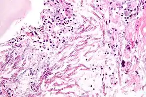 | H&E stain showing a fungal pneumonia (pulmonary aspergillosis) | |