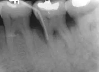 Evidence of furcal bone loss on #18 (lower left permanent second molar), along with a mesial vertical defect on the same tooth. The bent "stick" on the left of the tooth is a piece of gutta percha being used to trace the defect.