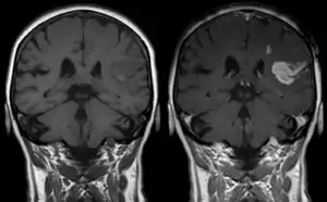 MRI contrast agents are contrast agents used to improve the visibility of internal body structures in magnetic resonance imaging (MRI).[1] The most commonly used compounds for contrast enhancement are gadolinium-based. Such MRI contrast agents shorten the relaxation times of nuclei within body tissues following oral or intravenous administration.