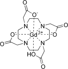 Gadoteric acid, sold under the brand name Dotarem among others, is a macrocycle-structured gadolinium-based MRI contrast agent (GBCA). It consists of the organic acid DOTA as a chelating agent, and gadolinium (Gd3+), and is used in form of the meglumine salt (gadoterate meglumine).[3] The paramagnetic property of gadoteric acid reduces the T1 relaxation time (and to some extent the T2 and T2* relaxation times) in MRI, which is the source of its clinical utility. Because it has magnetic properties, gadoteric acid develops a magnetic moment when put under a magnetic field, which increases the signal intensity (brightness) of tissues during MRI imaging.[4]