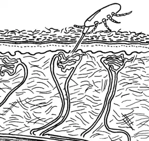 | Dermanyssus gallinae piercing skin with its long chelicerae to reach dermal capillaries (not to scale). | |