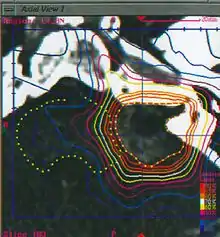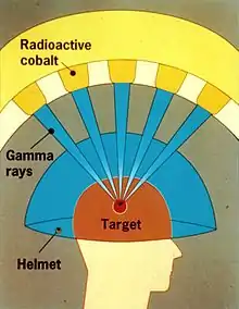 Stereotactic radiosurgery was first developed in 1949 by the Swedish neurosurgeon Lars Leksell to treat small targets in the brain that were not amenable to conventional surgery. The initial stereotactic instrument he conceived used probes and electrodes.[4] The first attempt to supplant the electrodes with radiation was made in the early fifties, with x-rays.[5] The principle of this instrument was to hit the intra-cranial target with narrow beams of radiation from multiple directions. The beam paths converge in the target volume, delivering a lethal cumulative dose of radiation there, while limiting the dose to the adjacent healthy tissue. Ten years later significant progress had been made, due in considerable measure to the contribution of the physicists Kurt Liden and Börje Larsson.[6] At this time, stereotactic proton beams had replaced the x-rays.[7] The heavy particle beam presented as an excellent replacement for the surgical knife, but the synchrocyclotron was too clumsy. Leksell proceeded to develop a practical, compact, precise and simple tool which could be handled by the surgeon himself. In 1968 this resulted in the Gamma Knife, which was installed at the Karolinska Institute and consisted of several cobalt-60 radioactive sources placed in a kind of helmet with central channels for irradiation with gamma rays.[8] This prototype was designed to produce slit-like radiation lesions for functional neurosurgical procedures to treat pain, movement disorders, or behavioral disorders that did not respond to conventional treatment. The success of this first unit led to the construction of a second device, containing 179 cobalt-60 sources. This second Gamma Knife unit was designed to produce spherical lesions to treat brain tumors and intracranial arteriovenous malformations (AVMs).[9] Additional units were installed in the 1980s all with 201 cobalt-60 sources.[10]