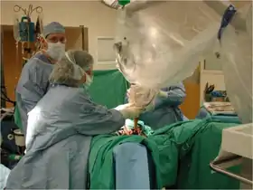 Radiosurgery is surgery using radiation,[1] that is, the destruction of precisely selected areas of tissue using ionizing radiation rather than excision with a blade. Like other forms of radiation therapy (also called radiotherapy), it is usually used to treat cancer. Radiosurgery was originally defined by the Swedish neurosurgeon Lars Leksell as "a single high dose fraction of radiation, stereotactically directed to an intracranial region of interest".[2]
