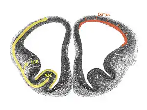 The primary purpose of the MGE during development is to produce GABAergic stellate cells and direct their migration to the neocortex.[6] The precursors of most GABAergic interneurons in the cerebral cortex migrate from the subcortical progenitor zone. More specifically, performing a mechanical transection of the migratory route from the MGE to the neocortex causes a 33% decrease in GABAergic interneurons in the neocortex.[6] The MGE also produces some of the neurons and glia of the basal ganglia and hippocampus.[6][7] The MGE may also be a source of Cajal-Retzius cells, but this remains controversial.[6] Early in embryonic development, the interneurons in the cortex stem primarily from the MGE [8]and the AEP. In vitro experiments show that MGE cells migrate more than 300 μm per day, three times faster than the migration of LGE cells.[2] See more about the time frame and function of MGE in comparison to the LGE in the following section.