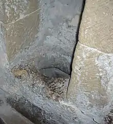 The term is also used to refer to a medieval or Renaissance toilet or a close stool.[2] In a medieval castle, a garderobe was usually a simple hole discharging to the outside into a cesspit (akin to a pit latrine) or the moat (like a fish pond toilet), depending on the structure of the building. Such toilets were often placed inside a small chamber, leading by association to the use of the term garderobe to describe the rooms. Many can still be seen in Norman and medieval castles and fortifications, for example at Bürresheim Castle in Germany, where three garderobes are still visible.[3] They became obsolete with the introduction of indoor plumbing.