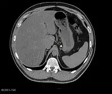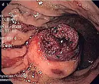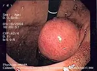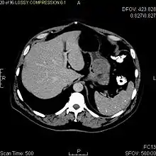 As the tumor grows it may project outside the bowel (exophytic growth) and/or inside the bowel (intraluminal growth), but they most commonly grow exophytically such that the bulk of the tumor projects into the abdominal cavity. If the tumor outstrips its blood supply, it can necrose internally, creating a central fluid-filled cavity with bleeding and cavitations that can eventually ulcerate and communicate into the lumen of the bowel. In that case, barium swallow may show an air, air-fluid levels or oral contrast media accumulation within these areas.[13][16] Mucosal ulcerations may also be present. In contrast enhanced CT images, large GISTs appear as heterogeneous masses due to areas of living tumor cells surrounding bleeding, necrosis or cysts, which is radiographically seen as a peripheral enhancement pattern with a low attenuation center.[12] In MRI studies, the degree of necrosis and bleeding affects the signal intensity pattern. Areas of bleeding within the tumor will vary its signal intensity depending on how long ago the bleeding occurred. The solid portions of the tumor are typically low signal intensity on T1-weighted images, are high signal intensity on T2-weighted images and enhance after administration of gadolinium. Signal-intensity voids are present if there is gas within areas of necrotic tumor.[14][17][18]