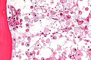 Micrograph showing crinkled paper macrophages in the marrow space in a case of Gaucher disease, H&E stain.