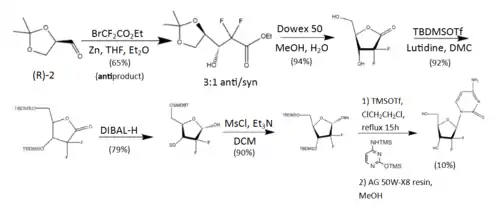 The synthesis described and pictured below is the original synthesis done in the Eli Lilly Company labs. Synthesis begins with enantiopure D-glyceraldehyde (R)-2 as the starting material which can made from D-mannitol in 2–7 steps. Then fluorine is introduced by a "building block" approach using ethyl bromodifluroacetate. Then, Reformatsky reaction under standard conditions will yield a 3:1 anti/syn diastereomeric mixture, with one major product. Separation of the diastereomers is carried out via HPLC, thus yielding the anti-3 gemcitabine in a 65% yield.[21][22] At least two other full synthesis methods have also been developed by different groups.[22]