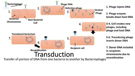 Transduction is the process by which foreign DNA is introduced into a cell by a virus or viral vector.[1] An example is the viral transfer of DNA from one bacterium to another and hence an example of horizontal gene transfer.[2] Transduction does not require physical contact between the cell donating the DNA and the cell receiving the DNA (which occurs in conjugation), and it is DNase resistant (transformation is susceptible to DNase). Transduction is a common tool used by molecular biologists to stably introduce a foreign gene into a host cell's genome (both bacterial and mammalian cells).