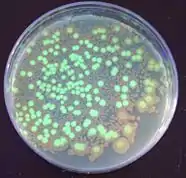 Other uses for genetically modified bacteria include bioremediation, where the bacteria are used to convert pollutants into a less toxic form. Genetic engineering can increase the levels of the enzymes used to degrade a toxin or to make the bacteria more stable under environmental conditions.[29] GM bacteria have also been developed to leach copper from ore,[30] clean up mercury pollution[31] and detect arsenic in drinking water.[32] Bioart has also been created using genetically modified bacteria. In the 1980s artist Joe Davis and geneticist Dana Boyd converted the Germanic symbol for femininity (ᛉ) into binary code and then into a DNA sequence, which was then expressed in Escherichia coli.[33] This was taken a step further in 2012, when a whole book was encoded onto DNA.[34] Paintings have also been produced using bacteria transformed with fluorescent proteins.[33][35][36]