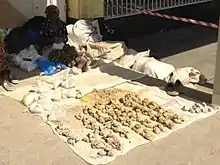In Africa, kaolin, sometimes known as kalaba (in Gabon[13] and Cameroon[14]), calaba, and calabachop (in Equatorial Guinea), is eaten for pleasure or to suppress hunger.[14] Kaolin for human consumption is sold at most markets in Cameroon and is often flavoured with spices such as black pepper and cardamom.[15] Consumption is greatest among women, especially during pregnancy.[16][17] Another example of geophagia was reported in Mangaung, Free State Province in South Africa, where the practice was geochemically investigated.[18]
