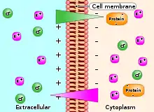 The Gibbs–Donnan effect (also known as the Donnan's effect, Donnan law, Donnan equilibrium, or Gibbs–Donnan equilibrium) is a name for the behaviour of charged particles near a semi-permeable membrane that sometimes fail to distribute evenly across the two sides of the membrane.[1] The usual cause is the presence of a different charged substance that is unable to pass through the membrane and thus creates an uneven electrical charge.[2] For example, the large anionic proteins in blood plasma are not permeable to capillary walls. Because small cations are attracted, but are not bound to the proteins, small anions will cross capillary walls away from the anionic proteins more readily than small cations.
