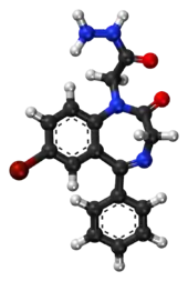 Gidazepam is a prodrug for its active metabolite 7-bromo-5-phenyl-1,2-dihydro-3H-1,4-benzodiazepine-2-one (desalkylgidazepam or bromo-nordazepam).[10][11] It is used as an antianxiety drug. Its anxiolytic effects can take several hours to manifest after dosing however, as it is the active metabolite which primarily gives the anxiolytic effects, and Gidazepam's half-life is among the longest of all GABA-ergic agonists.[12]