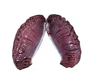 A high surface area is crucial to the gas exchange of aquatic organisms, as water contains only a small fraction of the dissolved oxygen that air does. A cubic meter of air contains about 250 grams of oxygen at STP. The concentration of oxygen in water is lower than in air and it diffuses more slowly. In fresh water, the dissolved oxygen content is approximately 8 cm3/L compared to that of air which is 210 cm3/L.[4] Water is 777 times more dense than air and is 100 times more viscous.[4] Oxygen has a diffusion rate in air 10,000 times greater than in water.[4] The use of sac-like lungs to remove oxygen from water would not be efficient enough to sustain life.[4] Rather than using lungs, "[g]aseous exchange takes place across the surface of highly vascularised gills over which a one-way current of water is kept flowing by a specialised pumping mechanism. The density of the water prevents the gills from collapsing and lying on top of each other, which is what happens when a fish is taken out of water."[4]