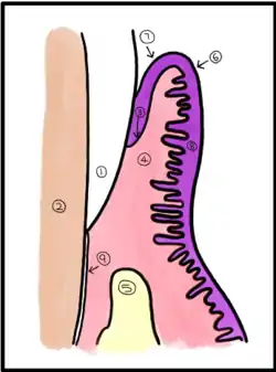 ![]() Gingival sulcus (G). Other letters: A, crown of the tooth, covered by enamel. B, root of the tooth, covered by cementum. C, alveolar bone. D, subepithelial connective tissue. E, oral epithelium. F, free gingival margin. H, principal gingival fibers. I, alveolar crest fibers of the PDL. J, horizontal fibers of the PDL. K, oblique fibers of the PDL. | |