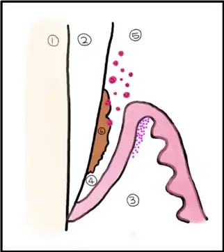 When the sulcular depth is chronically in excess of three millimeters, regular home care may be insufficient to properly cleanse the full depth of the sulcus, allowing food debris and microbes to accumulate, forming dental biofilm. This poses a danger to the periodontal ligament (PDL) fibers that attach the gingiva to the tooth. If accumulated microbes remain undisturbed in a sulcus for an extended period of time, they will penetrate and ultimately destroy the delicate soft tissue and periodontal attachment fibers. If left untreated, this process may lead to a deepening of the sulcus, recession, destruction of the periodontium, including the bony tooth socket, tooth mobility, and tooth loss.[8] A periodontal pocket is a dental term indicating the presence of an abnormally deepened gingival sulcus.