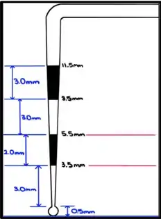 2) A World Health Organization (WHO) Probe should be used. Refer to attached picture for WHO Probe. The World Health Organization (WHO) Probe has a ball ended tip which is 0.5mm in diameter and some have 2 black bands for dental professionals to measure periodontal pocket depth. A light force equivalent to the weight of the probe should be used. World Health Organization (WHO) Probe ranges in mass from 20-25 grams.
