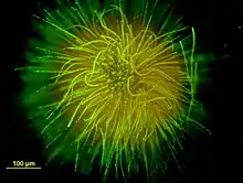 Gloeotrichia is a large (~2 mm) colonial genus of Cyanobacteria, belonging to the order Nostocales.[2] The name Gloeotrichia is derived from its appearance of filamentous body with mucilage matrix. Found in lakes across the globe, gloeotrichia are notable for the important roles that they play in the nitrogen and phosphorus cycles.[2][3] Gloeotrichia are also a species of concern for lake managers, as they have been shown to push lakes towards eutrophication and produce deadly toxins.[4][5]