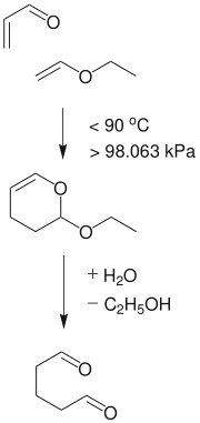 Glutaraldehyde is produced industrially by the oxidation of cyclopentene. Alternatively it can be made by the Diels-Alder reaction of acrolein and vinyl ethers followed by hydrolysis.[19]