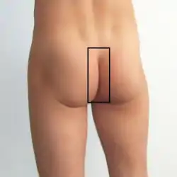 The intergluteal cleft, also known by a number of synonyms, including natal cleft, anus slice, butt crack, and cluneal cleft, is the groove between the buttocks that runs from just below the sacrum to the perineum,[1] so named because it forms the visible border between the external rounded protrusions of the gluteus maximus muscles. Other names are the anal cleft, crena analis, arena interglutealis, “cleftal horizon”, and rima ani. Colloquially the intergluteal cleft is known as bum crack (UK) or butt crack (US). The intergluteal cleft is located superior to the anus.