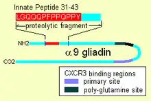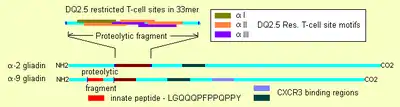 - 1 "α-I" site, 3 "α-II" sites, and 2 "α-III" sites, Qiao SW, Bergseng E, Molberg Ø; et al. (August 2004). "Antigen presentation to celiac lesion-derived T cells of a 33-mer gliadin peptide naturally formed by gastrointestinal digestion". J. Immunol. 173 (3): 1757–62. doi:10.4049/jimmunol.173.3.1757. PMID 15265905.CS1 maint: multiple names: authors list (link)