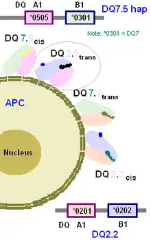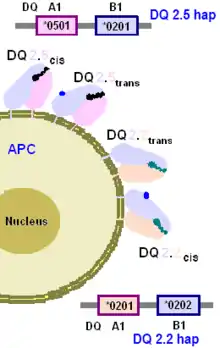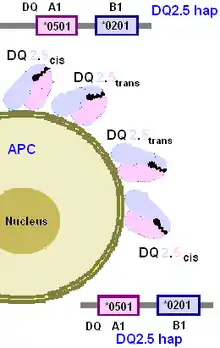 The major gluten proteins that are involved in coeliac disease are the α-gliadin isoforms. Alpha gliadin is composed of repeated motifs that, when digested, can be presented by HLA-DQ molecules. DQ2.5 recognizes several motifs in gluten proteins, and therefore HLA-DQ can recognize many motifs on each gliadin (see Understanding DQ haplotypes and DQ isoforms on the right)[18] However, numbers of different proteins from the grass tribe Triticeae have been found to carry motifs presented by HLA DQ2.5 and DQ8. Wheat has a large number of these proteins because its genome contains chromosomes derived from two goat grass species and a primitive wheat species.[19][20] The positions of these motifs in different species, strains and isoforms may vary because of insertions and deletions in sequence. There are a large number of wheat variants, and a large number of gliadins in each variant, and thus many potential sites. These proteins once identified and sequenced can be surveyed by sequence homology searches.