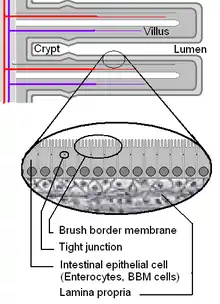 Some alpha gliadin have other direct-acting properties. Other gliadin peptides, one in a glutamine rich region and another peptide, "QVLQQSTYQLLQELCCQHLW", bind a chemoattractant receptor, CXCR3. Gliadin binds to, blocks and displaces a factor, I-TAC, that binds this receptor.[2] In the process it recruits more CXCR3 receptor, increases MyD88 and Zonulin expression.[1][9] The factor it displaces, I-TAC, is a T-cell attractant. This peptide may also be involved in increased risk for type 1 diabetes as zonulin production is also a factor.[10] This triggering of zonulin ultimately results in the degradation of tight junctions allowing large solutes, such as proteolytic resistant gliadin fragments to enter behind the brush border membrane cells.