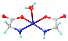 Glycine functions as a bidentate ligand for many metal ions. A typical complex is Cu(glycinate)2, i.e. Cu(H2NCH2CO2)2, which exists both in cis and trans isomers.