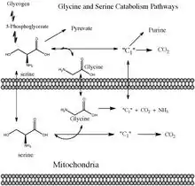 In humans and most vertebrates, the glycine cleavage system is part of the most prominent glycine and serine catabolism pathway. This is due in large part to the formation 5,10-methylenetetrahydrofolate, which is one of the few C1 donors in biosynthesis.[2] In this case the methyl group derived from the catabolism of glycine can be transferred to other key molecules such as purines and methionine.