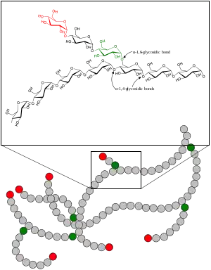 Glucose units are linked together linearly by α(1→4) glycosidic bonds from one glucose to the next. Branches are linked to the chains from which they are branching off by α(1→6) glycosidic bonds between the first glucose of the new branch and a glucose on the stem chain.[18]