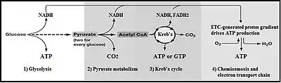 Cells performing aerobic respiration synthesize much more ATP, but not as part of glycolysis. These further aerobic reactions use pyruvate, and NADH + H+ from glycolysis. Eukaryotic aerobic respiration produces approximately 34 additional molecules of ATP for each glucose molecule, however most of these are produced by a mechanism vastly different than the substrate-level phosphorylation in glycolysis.
