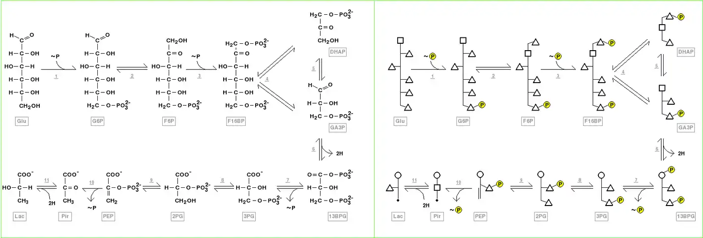 Glycolysis - Structure of anaerobic glycolysis components showed using Fischer projections, left, and polygonal model, right. The compounds correspond to glucose (GLU), glucose 6-phosphate (G6P), fructose 6-phosphate (F6P), fructose 1,6-bisphosphate ( F16BP), dihydroxyacetone phosphate (DHAP), glyceraldehyde 3-phosphate(GA3P), 1,3-bisphosphoglycerate (13BPG), 3-phosphoglycerate (3PG), 2-phosphoglycerate (2PG), phosphoenolpyruvate (PEP), pyruvate (PIR), and lactate (LAC). The enzymes which participate of this pathway are indicated by underlined numbers, and correspond to hexokinase (1), glucose-6-phosphate isomerase (2), phosphofructokinase-1 (3), fructose-bisphosphate aldolase (4), triosephosphate isomerase (5), glyceraldehyde-3-phosphate dehydrogenase (5), phosphoglycerate kinase (7), phosphoglycerate mutase (8), phosphopyruvate hydratase (enolase) (9), pyruvate kinase (10), and lactate dehydrogenase (11). The participant coenzymes (NAD+, NADH + H+, ATP and ADP), inorganic phosphate, H2O and CO2 were omitted in these representations. The phosphorylation reactions from ATP, as well the ADP phosphorylation reactions in later steps of glycolysis are shown as ~P respectively entering or going out the pathway. The oxireduction reactions using NAD+ or NADH are observed as hydrogens “2H” going out or entering the pathway.
