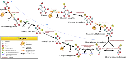 Glycolysis is the metabolic pathway that converts glucose C6H12O6, into pyruvate, CH3COCOO, and a hydrogen ion, H+. The free energy released in this process is used to form the high-energy molecules ATP (adenosine triphosphate) and NADH (reduced nicotinamide adenine dinucleotide).[1][2][3] Glycolysis is a sequence of ten enzyme-catalyzed reactions. Most monosaccharides, such as fructose and galactose, can be converted to one of these intermediates. The intermediates may also be directly useful rather than just utilized as steps in the overall reaction. For example: the intermediate dihydroxyacetone phosphate (DHAP) is a source of the glycerol that combines with fatty acids to form fat.