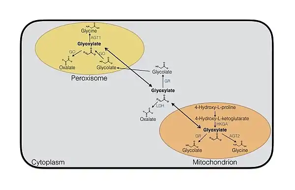 Glyoxylate is produced via two pathways: through the oxidation of glycolate in peroxisomes or through the catabolism of hydroxyproline in mitochondria.[16] In the peroxisomes, glyoxylate is converted into glycine by AGT1 or into oxalate by glycolate oxidase. In the mitochondria, glyoxylate is converted into glycine by AGT2 or into glycolate by glyoxylate reductase. A small amount of glyoxylate is converted into oxalate by cytoplasmic lactate dehydrogenase.[17]