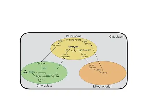 In addition to being an intermediate in the glyoxylate pathway, glyoxylate is also an important intermediate in the photorespiration pathway. Photorespiration is a result of the side reaction of RuBisCO with O2 instead of CO2. While at first considered a waste of energy and resources, photorespiration has been shown to be an important method of regenerating carbon and CO2, removing toxic phosphoglycolate, and initiating defense mechanisms.[18][19] In photorespiration, glyoxylate is converted from glycolate through the activity of glycolate oxidase in the peroxisome. It is then converted into glycine through parallel actions by SGAT and GGAT, which is then transported into the mitochondria.[20][19] It has also been reported that the pyruvate dehydrogenase complex may play a role in glycolate and glyoxylate metabolism.[21]