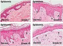 Micrographs of grades of skin graft-versus-host-disease: Ranging from grade I GvHR (with minimal vacuolization in the epidermis) to grade II GvHR (with vacuolization and dyskeratotic bodies) to grade III GvHR (with sub epidermal cleft formation) and finally to grade IV GvHR (with separation of the dermis from the epidermis).[1]