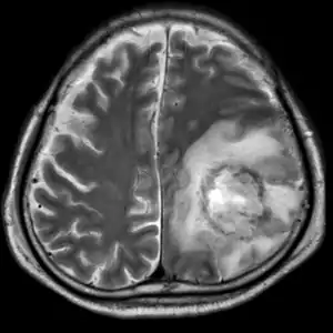 | T2-weighted MRI showing liquefied, necrotic brain tissue as a result of GAE caused by an infection of Acanthamoeba, genotype T18 | |