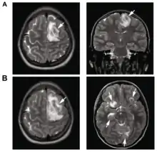 Some of the symptoms may mimic glioma (especially brainstem glioma), or other brain diseases, which may hamper timely diagnosis. The symptoms are caused by inflammatory necrosis of brain tissue brought on by compounds released from the organisms.